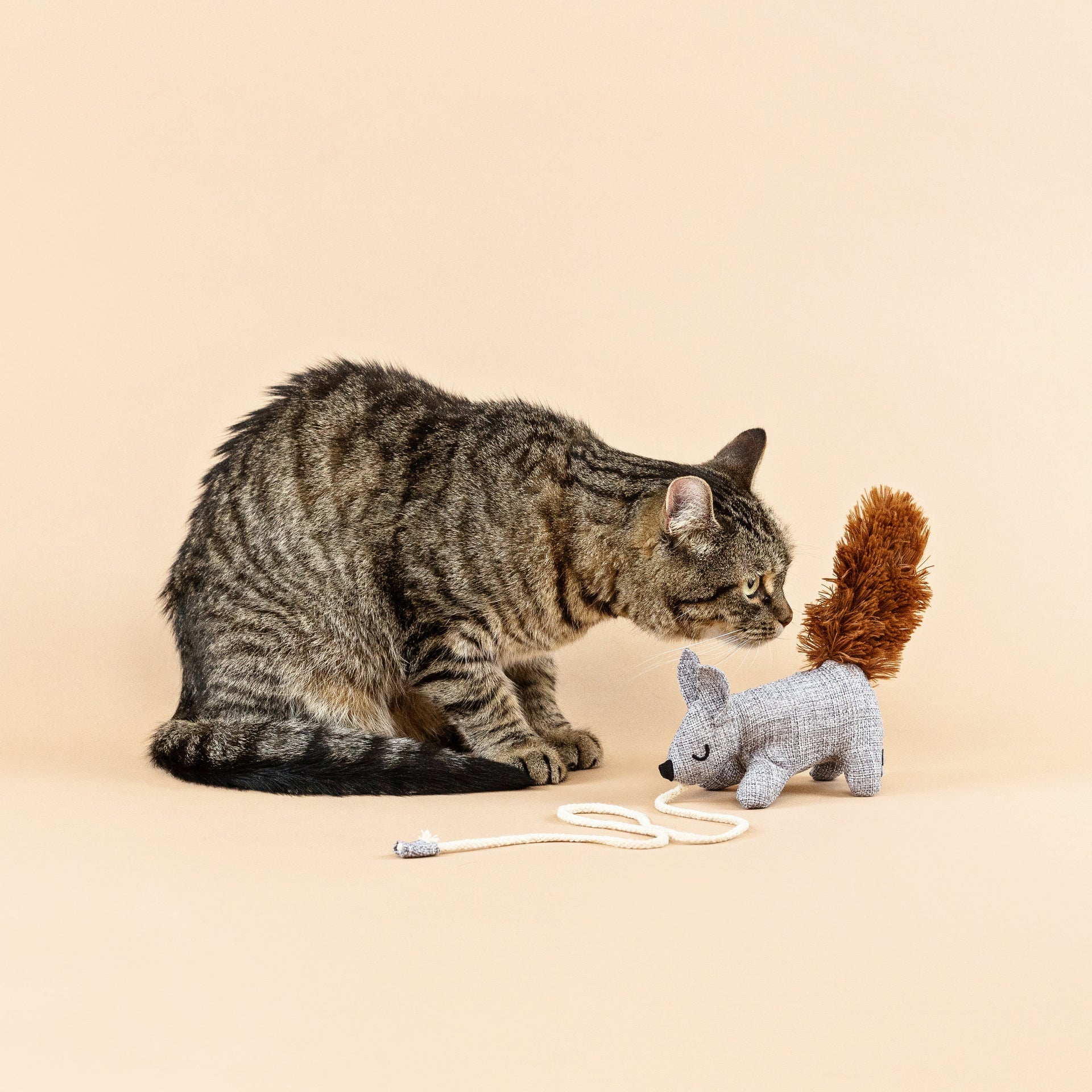 Our “One Tuff Nut” multi-sensory teaser cat toy is the perfect playdate for you and your kitty. Featuring a faux linen body, a fluffy faux fur tail, dangling rope, North American grown catnip, and crazy crinkle paper, this toy was designed with interactive play in mind and a look that complements modern home décor. However kitty likes to play, this toy is sure to cat-ch their attention.