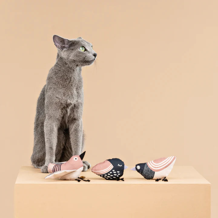 Our “Under My Wings” 3 piece mini toy set is purrfect for the sassy kitty. Made with durable cotton canvas, North American grown catnip, crazy crinkle paper, dangling rope, and printed with water based and non-toxic ink, these toys were designed with interactive play in mind and a look that complements modern home décor. Whether your cat likes to pounce, bat, or chase, this trio really knows how to wing it.