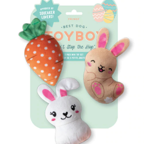 Bunny Squad! Petshop by Fringe Studio “Can’t Stop the Hop” mini toy set is perfect for the pup that likes to play all day. Made with a loud squeaker in each toy and crazy crinkle paper details, this trio will be all your pup carrots about.