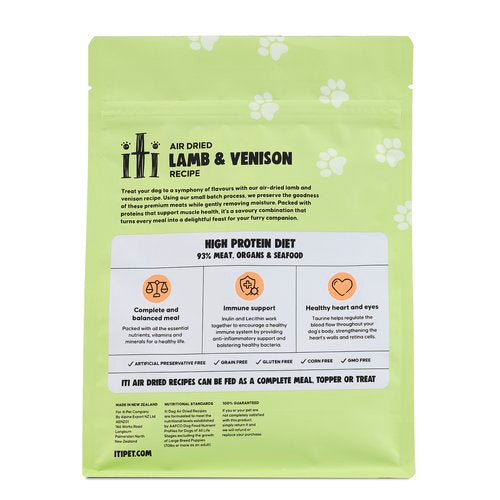 Lamb, Lamb Lung, Lamb Liver, Venison, Flaxseed, Green Lipped Mussel, Lecithin, Coconut Glycerine, Lamb Bone, Dipotassium Phosphate , Salt, Calcium Carbonate, Choline Chloride, Taurine, Natural Antioxidant, Iron, Zinc, Vitamin E, Selenium, Copper, Vitamins B1, A, B3, B5, Manganese, Vitamins B2, B6, D, Biotin, Vitamin B12, Iodine, Folic Acid.
