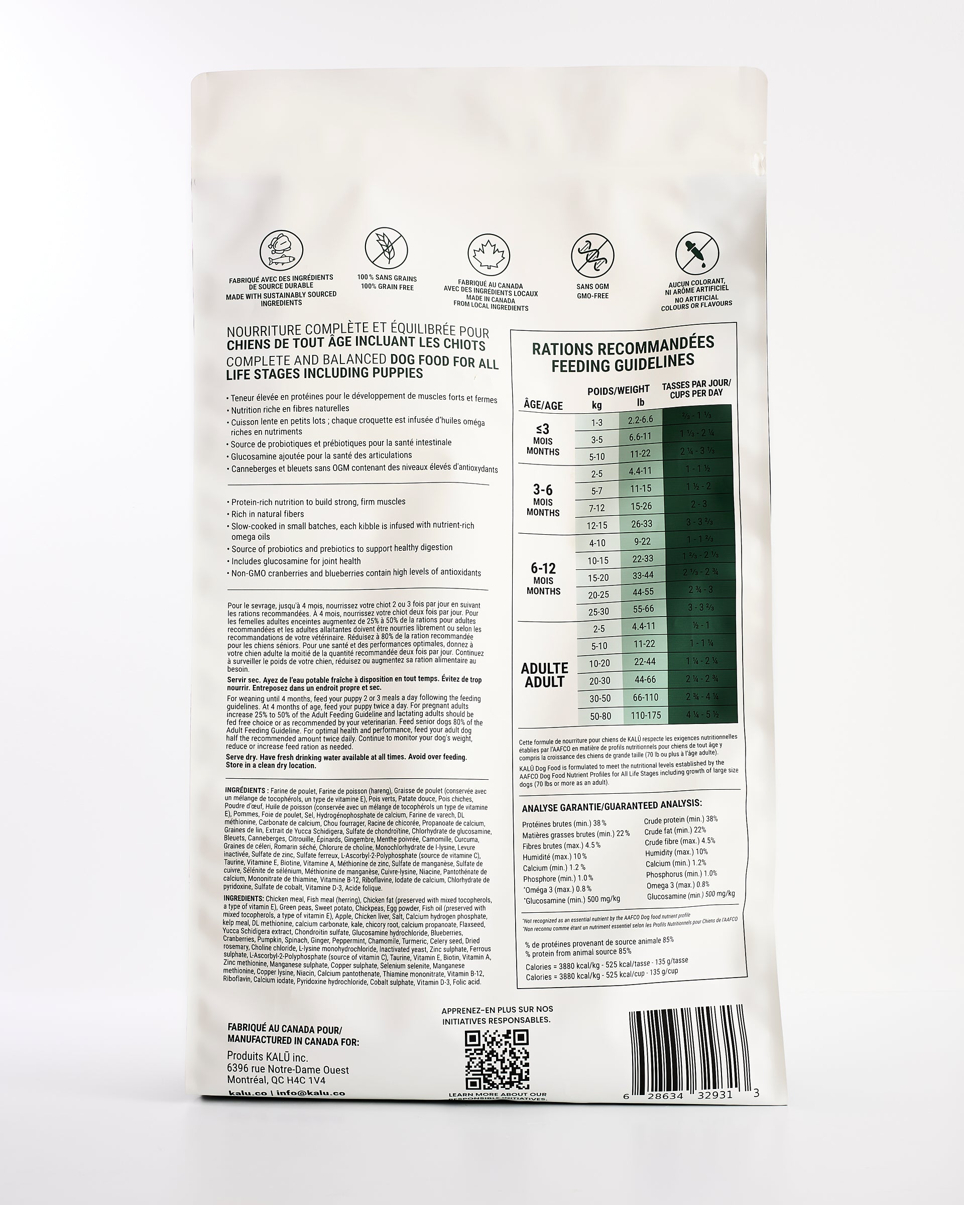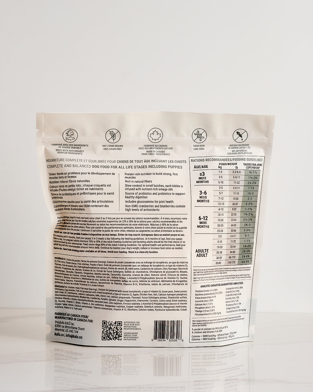 This formula, made with chicken, sweet potato and apples, was created to meet the needs of dogs of all ages, from 3 months of age. Prepared in Canada with local ingredients and 100% grain free, it has a high percentage of protein for an active and healthy dog with strong and firm muscles.