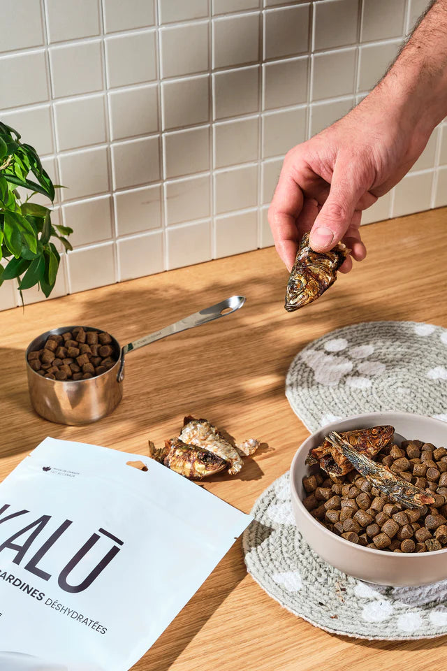 Discover our dehydrated sardines, a natural and tasty treat for your pet. Made from a single source of high-quality protein, our sardines are carefully selected and dehydrated without any added colours or artificial flavours. These Canadian treats, sourced from sustainable fisheries, are rich in Omega-3, beneficial for the health of your four-legged friend.