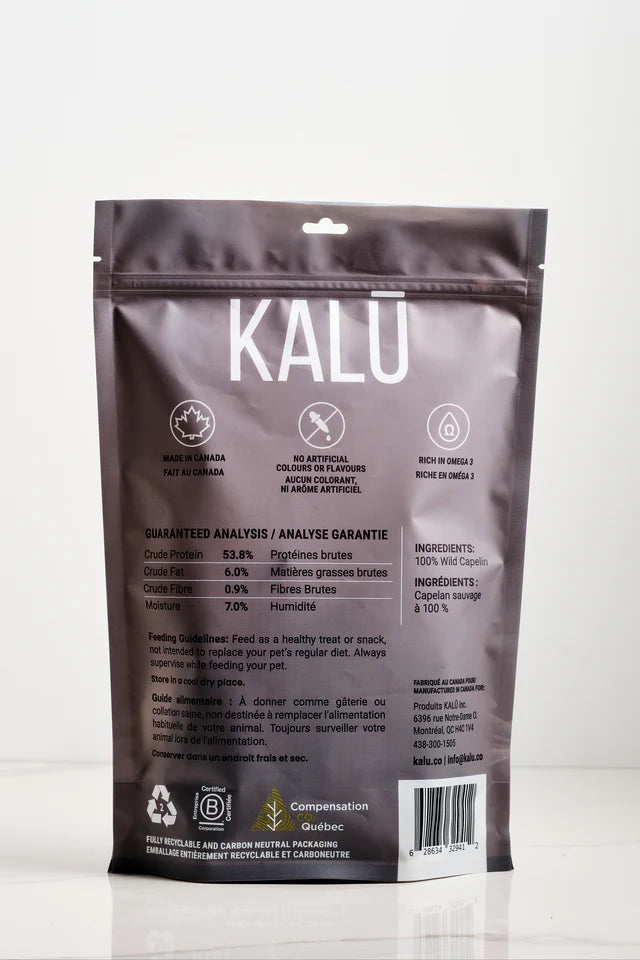 Offer our premium treats, made exclusively from dehydrated wild capelin. Free from any artificial colors or flavors, these treats are a pure source of well-being for your pet. Made in Canada, they are sourced from sustainable fisheries, ensuring total respect for the marine environment.