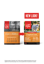 Help your cat thrive with the power of protein-rich recipes that provide peak nourishment. As obligate carnivores, modern cats are built like their ancestors and thrive on a Biologically Appropriate diet rich in protein and fat sourced from a variety of animal ingredients. ORIJEN® Original Cat diet is made with fresh or raw1 free-run2 chicken and turkey and wild-caught fish. Packed with WholePrey animal ingredients like poultry, fish, organs and bone, ORIJEN Original Cat diet is made with the most nutrient-dense, succulent parts of the prey to deliver the nutrition cats need. With 85%3 quality animal ingredients and a freeze-dried liver coating, this diet is beyond comparison.
