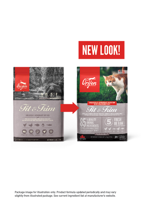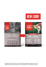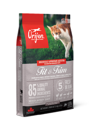 Help your cat thrive with the power of protein-rich recipes that provide peak nourishment. As obligate carnivores, all cats are meant to eat a Biologically Appropriate diet rich in protein from whole animal ingredients. ORIJEN® Fit & Trim diet is optimized to support lean muscle mass and is specifically designed to support peak physical conditioning with quality animal ingredients from fresh or raw1 chicken, turkey and wild-caught fish. With rich inclusions of WholePrey animal ingredients like poultry, fish, organs and bone, ORIJEN Fit & Trim diet is made with the most nutrient-dense, succulent parts of the prey to deliver the lean nutrition cats need. With 85%2 quality animal ingredients and a freeze-dried liver coating, this diet is beyond comparison.