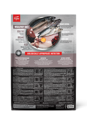 Ingredients: Fresh chicken (20%), fresh chicken giblets (liver, heart) (11%), raw whole herring (8%), raw turkey (6%), raw whole hake (5%), fresh eggs (5%), raw whole mackerel (4%), dehydrated chicken (4%), dehydrated turkey (4%), dehydrated mackerel (4%), dehydrated sardine (3%), dehydrated herring (3%), dehydrated whitefish (3%), raw turkey liver (3%), lentil fibre, whole red lentils, whole green lentils, whole peas, whole chickpeas, whole pinto beans, pea starch, whole navy beans, dehydrated blue whiting (1%), chicken fat (1%), apple fibre, dried kelp, algae (source of DHA), fresh whole pumpkin, fresh whole butternut squash, fresh whole zucchini, fresh whole carrots, fresh whole apples, fresh whole pears, dried chicory root, fresh kale, fresh spinach, fresh beet greens, fresh turnip greens, whole cranberries, whole blueberries, whole saskatoon berries, turmeric, milk thistle, burdock root, lavender, marshmallow root, rosehips.