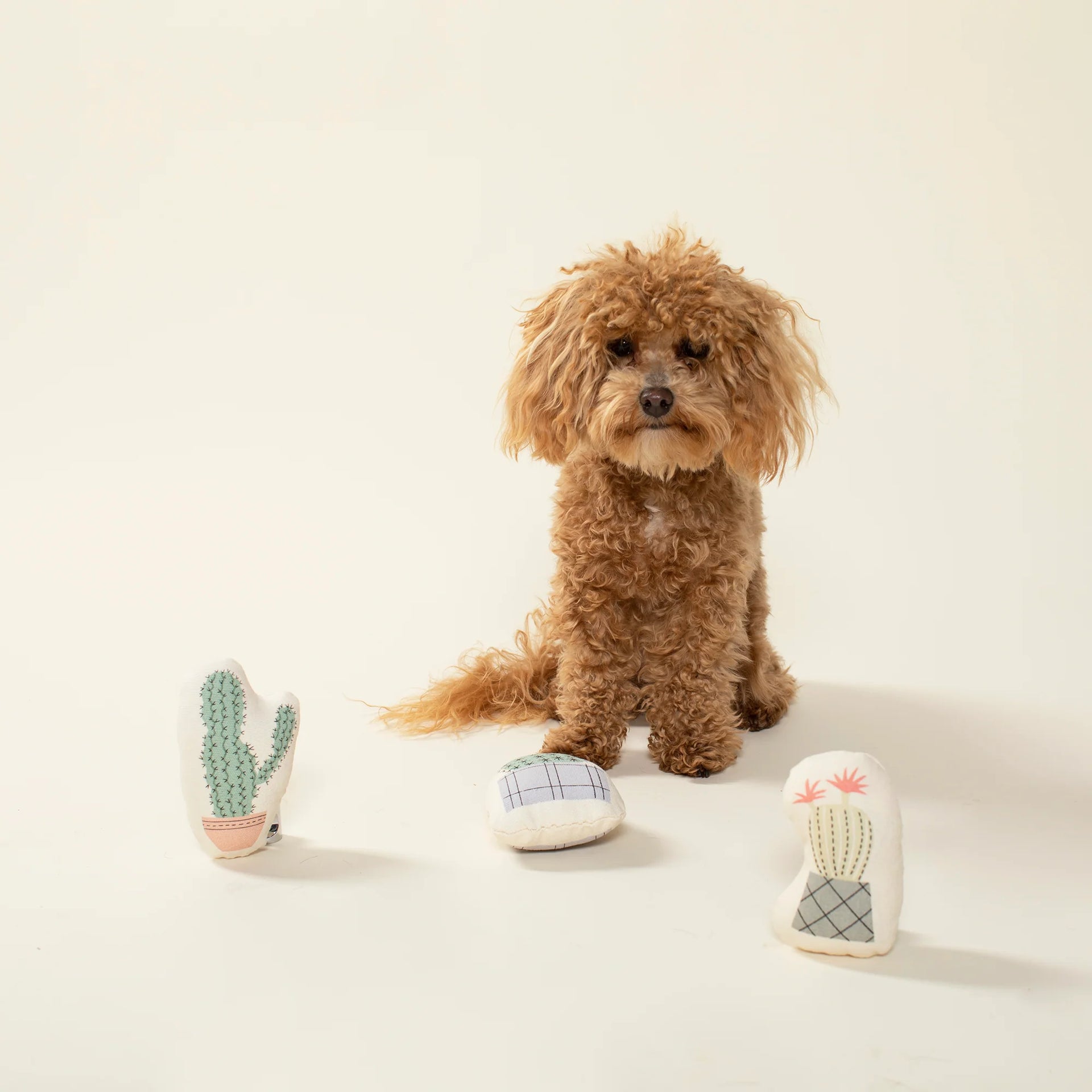 Our “Potted Cactus Set” 3 piece mini toy set is is the perfect playdate for your pup. Featuring durable cotton canvas, a super loud squeaker, stuffed with fluff, and printed with water based and non-toxic ink, these toys were designed with interactive play in mind and a look that complements modern home décor. Whether you squeak or toss them, your pup will think these toys are on point.
