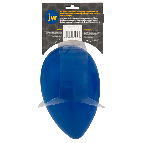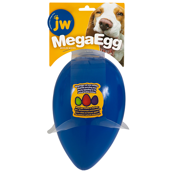 Keep your dog busy for hours with JW® Mega Eggs™. Great for solo playtime or fetch, the egg-shaped design makes it nearly impossible for dogs to get a solid grip with their paws or mouth, causing the Mega Egg to "shoot" out from under them, creating an endless game of chase! The constant, erratic motion will keep your dog entertained while engaging their natural hunting and chasing instincts at the same time. JW Mega Eggs are made from durable, non-toxic plastic designed to resist punctures and are built to last.