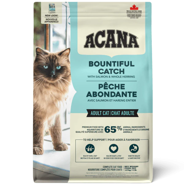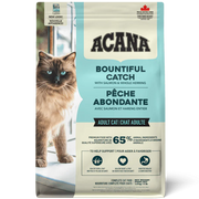 Specially crafted with a bounty of fish, our ACANA™ Bountiful Catch Recipe satisfies your cat with rich fish ingredients. Rich with 65% quality animal ingredients1 including raw salmon and whole herring, Bountiful Catch has the animal protein your cat needs to be their best. This nutrient-dense recipe also helps support key health benefits for your cat, including healthy skin & coat, healthy heart & eyes and digestive health. Nurture your feline with a fish-forward recipe tailored to keep them healthy and happy with ACANA Bountiful Catch!