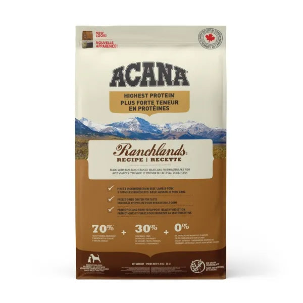 ACANA Ranchlands Dog is formulated to meet the nutritional levels established by FEDIAF for All Life Stages, except for growth of large size dogs. Store in a cool, dry place. Not fit for human consumption. | Metabolizable Energy is 3790 kcal/kg (455 kcal per 250ml/120g cup), with 37% from protein, 23% from carbohydrates, and 40% from fat.