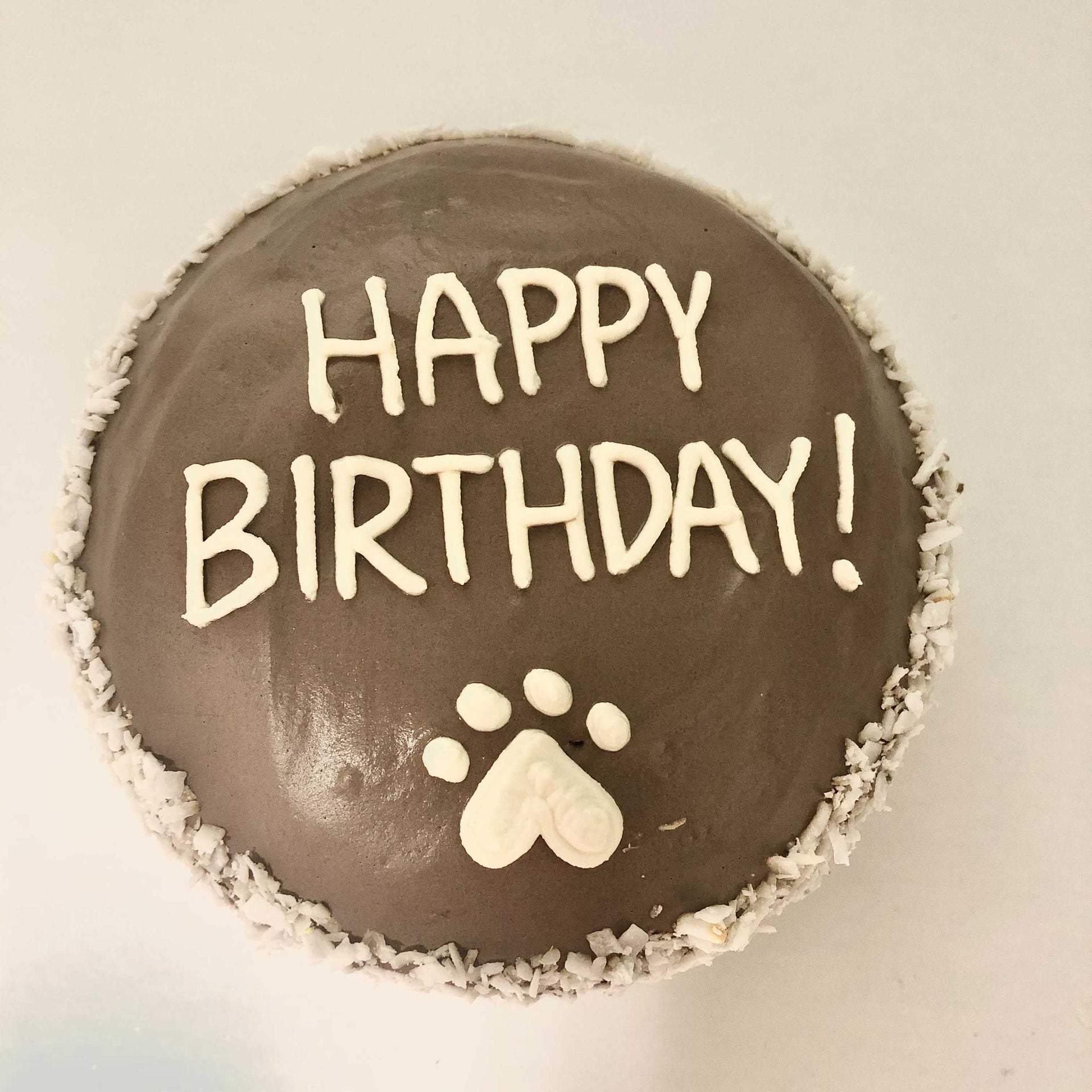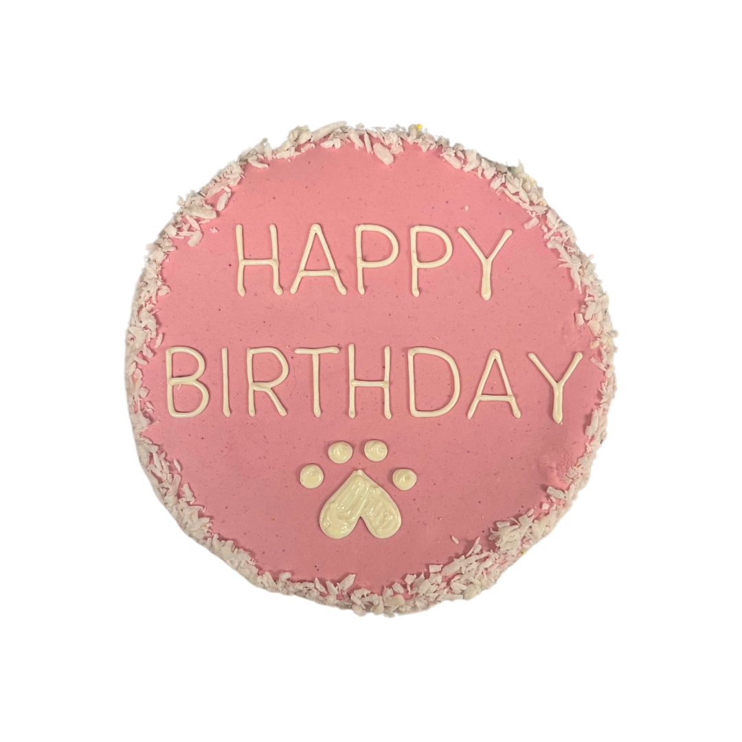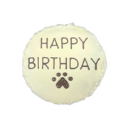 Made right from our in house bakery! A choice of our 5" Happy Birthday round cake in either Original Peanut Butter or Grain Free Pumpkin. Cakes are premade, frozen and ready to go. Just thaw and serve! Sorry no customization available as the icing will not have enough time to set. These cakes are pre-decorated and frozen.