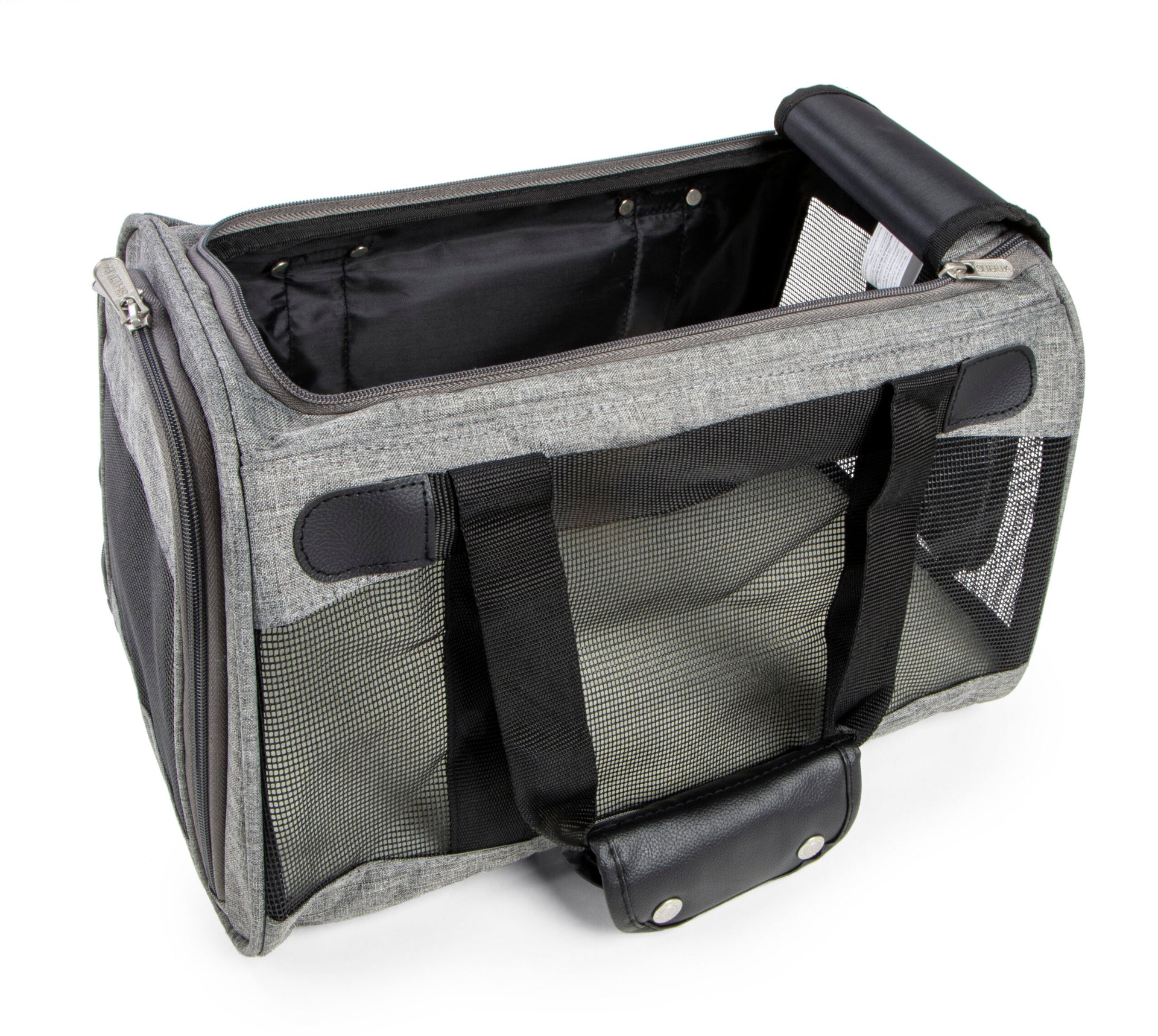 Travel in comfort and style with Sherpa® Element™ Pet Carrier. Perfect for traveling by plane or car, for a trip, or just to the vet. A patented spring wire frame allows the rear end of the carrier to be pushed down several inches to conform to under-seat requirements. The carrier has mesh panels for ventilation, locking zippers to prevent accidental escapes, and includes a seat belt security strap that doubles as a luggage strap. Top and side entries make it easier to comfortably load pets into our carrier. A large side zippered pocket can hold important pet travel documents and anything else your pet may need. A soft, cozy, removable, machine-washable faux lambskin liner is included.