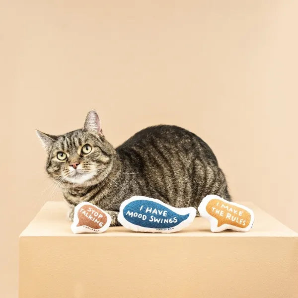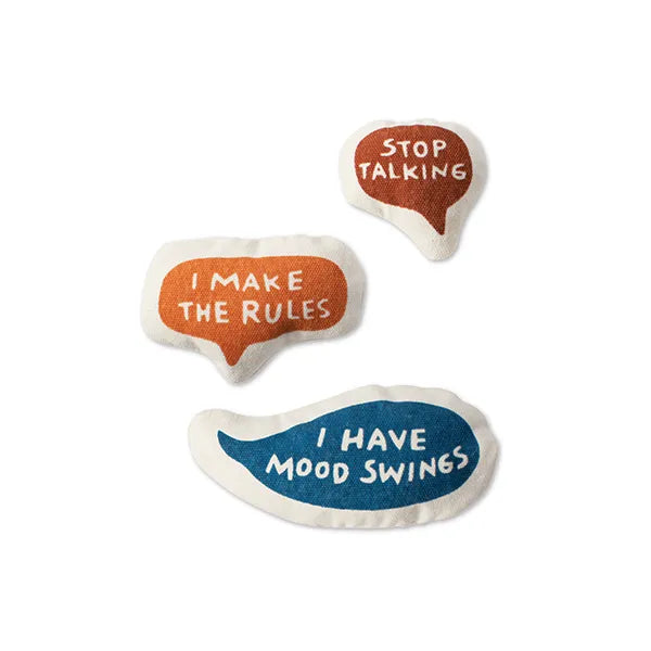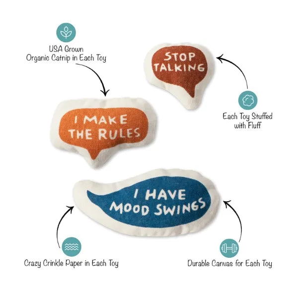 Fringe Petshop Mr. Listen Up Canvas Mini Cat Toy is a set of speech bubble plush toys that are ready for hours of fun. This set of toys are made from cotton canvas, and inside each fish is catnip sourced from the USA to keep your feline friend engaged.