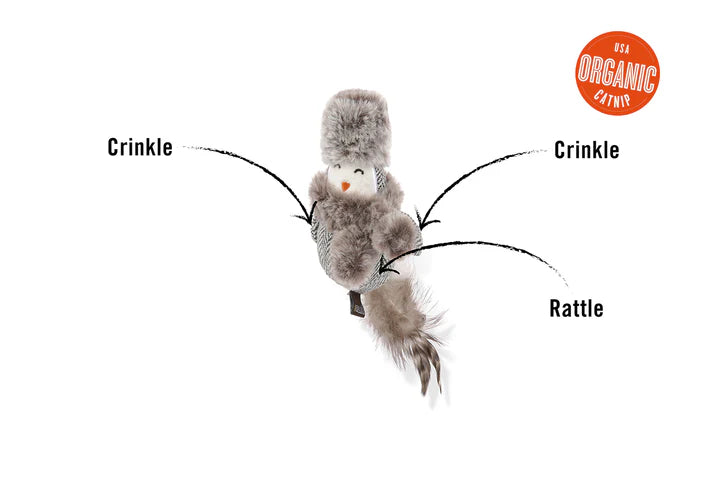 Introduce your kitty to P.L.A.Y.'s Feline Frenzy Blissful Birdie Toy. This snowy feathered friend is ready to play with delightful crinkles, engaging rattles, and charming feathers, it's the perfect companion for your cat's holiday adventures.