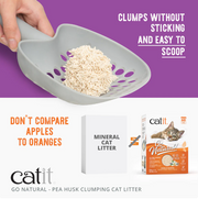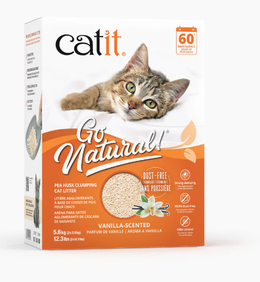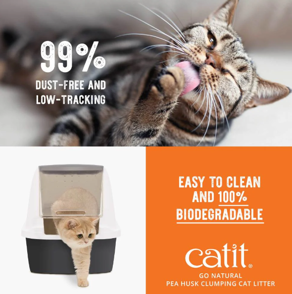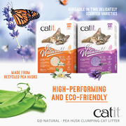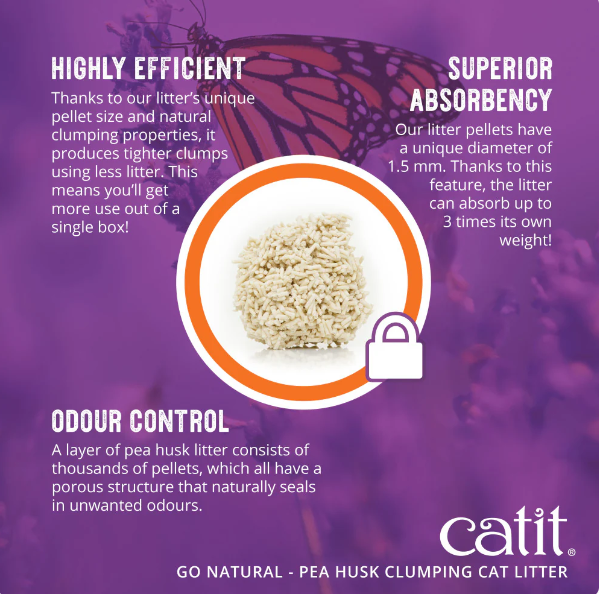 Catit Go Natural is a litter that, unlike mineral cat litter, is based on sustainable sources. Plant-based litter is a safer and more planet-friendly litter choice. Finally, your cat can ‘go’ as they would in nature! Made from empty pea husks that would otherwise get discarded, and mixed with raw, food-grade materials such as starch, corn powder, and guar gum as natural clumping agents. The result is a beautiful and highly absorbent litter that clumps naturally without a speck of dust!