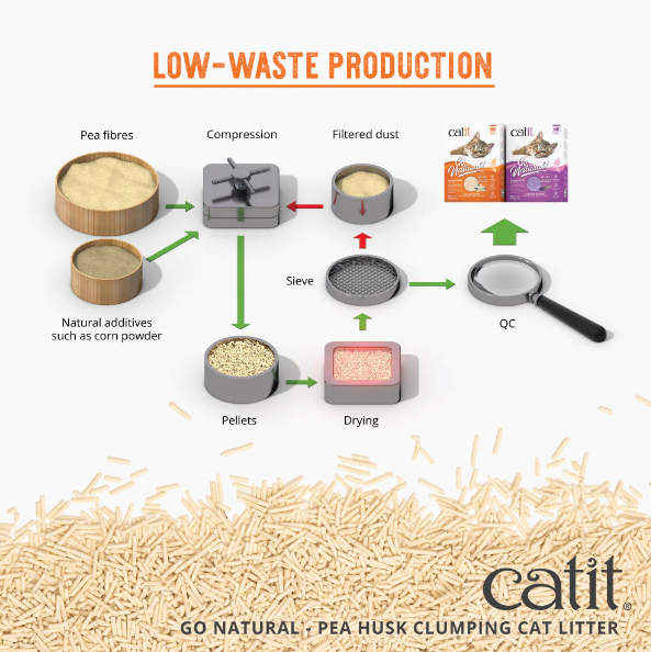 Catit Pea Husk Litter ingredients are mixed and compressed into tiny pellets of 0.06 inches (1.5 mm) in diameter, which is only half as thick as most other pea husk litters. The pea husk pellets can absorb 300% or about 3 times their own weight in cat waste, thanks to their unique diameter.