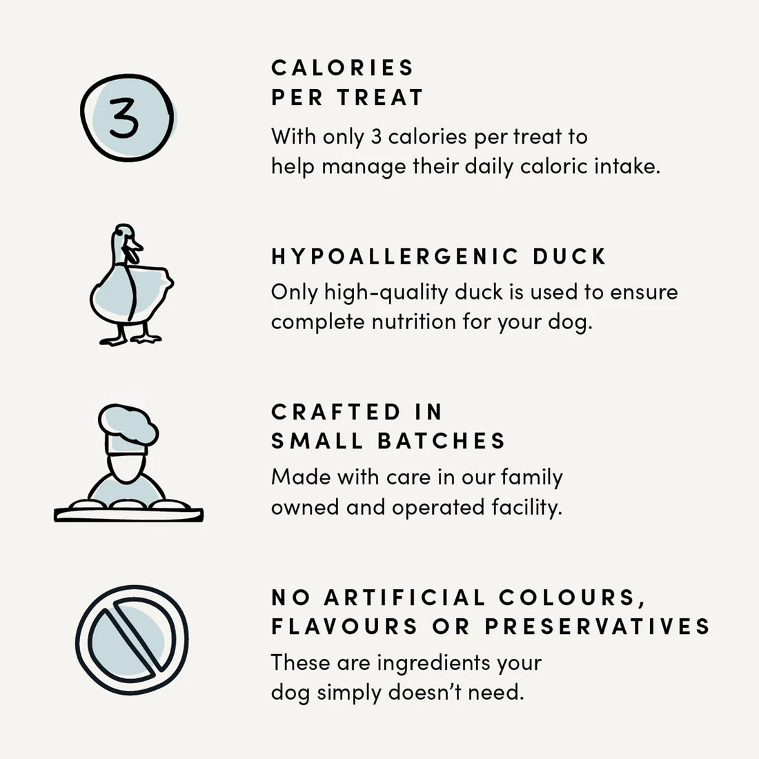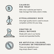 NEW! Each soft and chewy treat contains all natural ingredients starting with Duck making it the perfect high protein snack for dogs of all ages and sizes. Duck is an alternative protein ideal for dogs with specific allergies or food sensitivities.