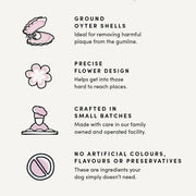 Newly reformulated to provide a less brittle, more flexible texture to ensure safe chewing - no sharp edges! A new floral shape was also introduced to boost the oral care benefit by better fitting around each tooth.