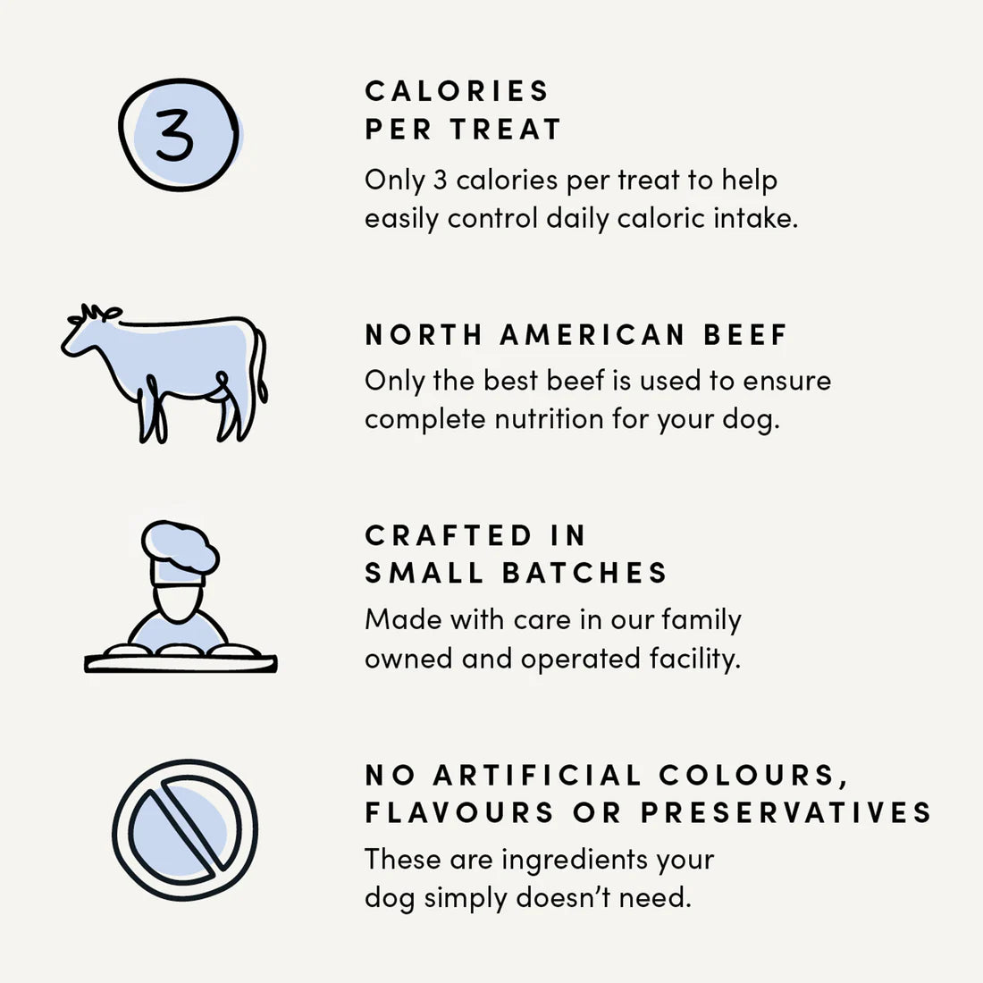 Each soft and chewy treat contains all natural ingredients starting with North American Beef making it the perfect high protein snack for dogs of all ages and sizes.