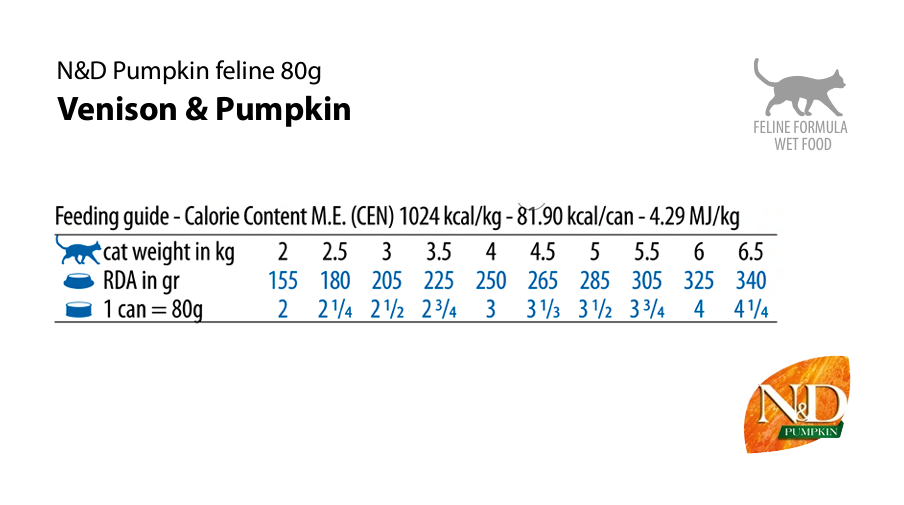 N&D Pumpkin Cat Venison & Pumpkin Recipe is formulated to meet the nutritional levels established by the AAFCO Cat Food Nutrient Profiles for maintenance. 100% Satisfaction Guaranteed.