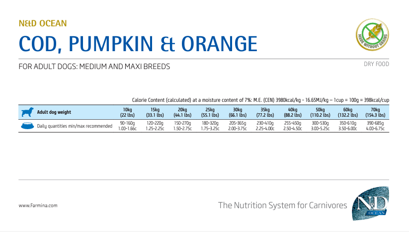 N&D Cod, pumpkin and orange recipe is formulated to meet the nutritional levels established by the AAFCO Dog Food Nutrient Profiles for maintenance.