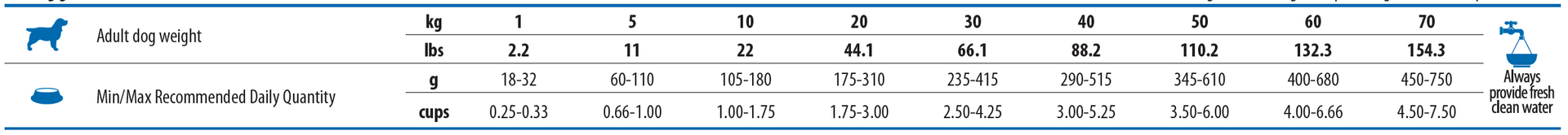 Crude Protein (min): 23.00%; Crude Fat (min): 12.00%; Crude Fiber (max): 2.80%; Moisture (max): 9.00%; Ash (max): 7.90%; Docosahexaenoic Acid (DHA) (min): 0.20%; Eicosapentaenoic Acid (EPA) (min): 0.10%; Calcium (min): 1.00%; Phosphorus (min): 0.80%; Omega-6 Fatty Acids* (min): 2.20%; Omega-3 Fatty Acids* (min): 0.40%; Glucosamine *(min): 1200mg/kg; Chondroitin sulfate* (min): 900mg/kg. *Not recognized as an essential nutrient by the AAFCO Dog Food Nutrient Profiles.