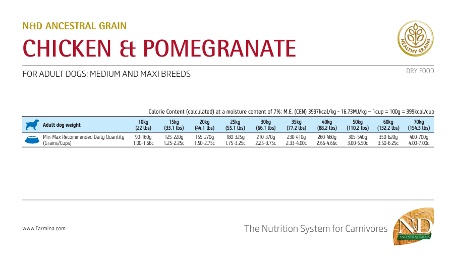 N&D Chicken, spelt, oats and pomegranate recipe is formulated to meet the nutritional levels established by the AAFCO Dog Food Nutrient Profiles for maintenance.