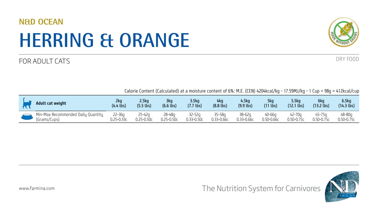 N&D Herring and orange recipe is formulated to meet the nutritional levels established by the AAFCO Cat Food Nutrient Profiles for maintenance.