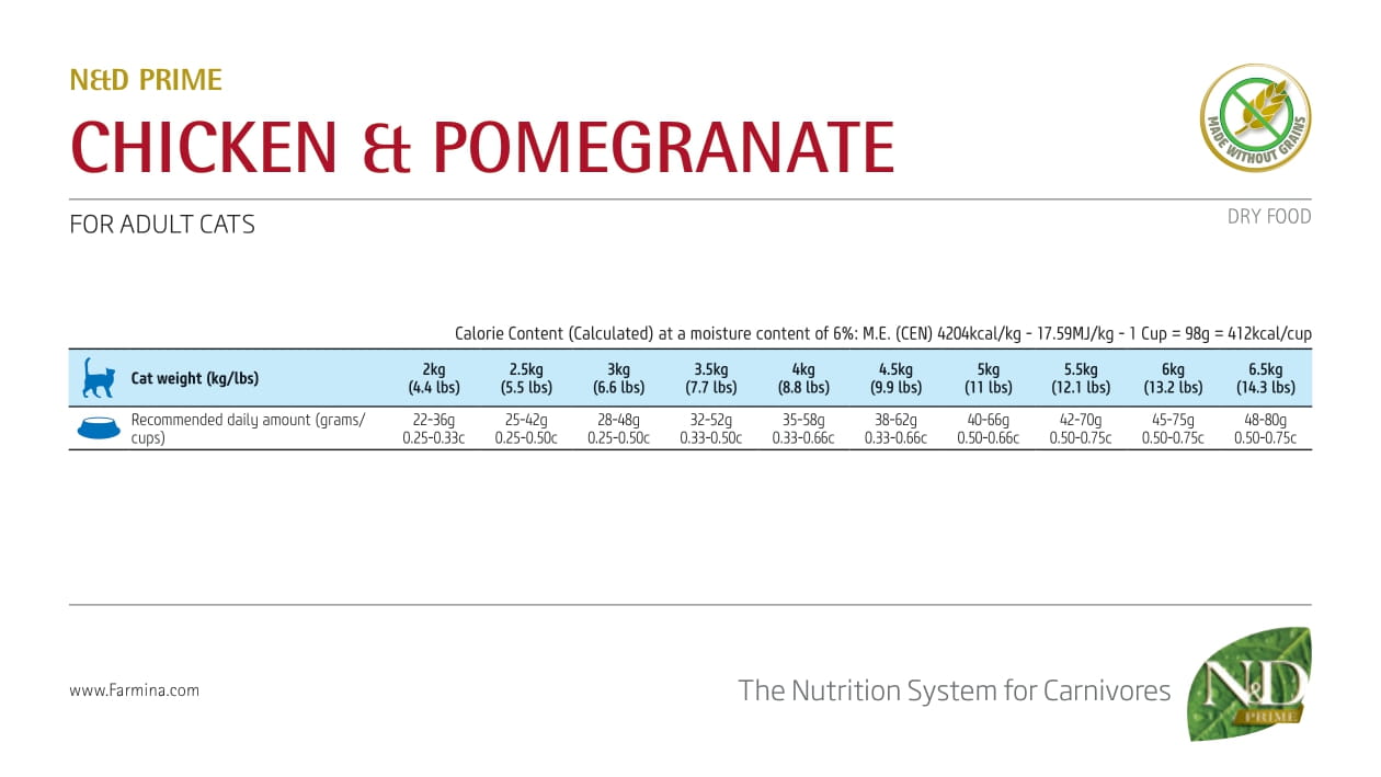 N&D Chicken and pomegranate recipe is formulated to meet the nutritional levels established by the AAFCO Cat Food Nutrient Profiles for maintenance.