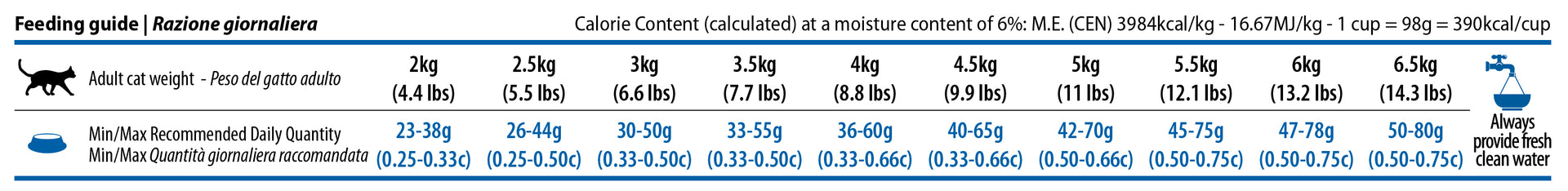Guaranteed Analysis: crude protein (min): 33.00%; crude fat (min): 16.50%; crude fiber (max): 2.10%; moisture (max): 8.00%; ash (max): 7.90%; Docosahexaenoic Acid (DHA) (min): 0.15%; Eicosapentaenoic Acid (EPA) (min): 0.10%; calcium (min): 1.00%; phosphorus (min): 0.90%; sodium (min): 0.50%; potassium (min): 0.70%; magnesium (min): 0.08%; chloride (min): 0.75%; sulphur (min): 0.40%; taurine (min): 0.20%; Omega-6 Fatty Acids* (min): 3.20%; Omega-3 Fatty Acids* (min): 0.40%. *Not recognized as an essential nutrient by the AAFCO Cat Food Nutrient Profiles.