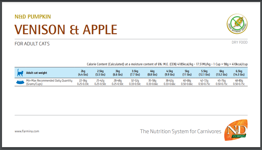 Farmina N&D Pumpkin Venison & Apple is formulated to meet the nutritional levels established by the AAFCO Cat Food Nutrient Profiles for all life stages.