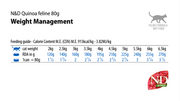 N&D Quinoa Cat Weight Management Recipe is formulated to meet the nutritional levels established by the AAFCO Cat Food Nutrient Profiles for maintenance. 100% Satisfaction Guaranteed.