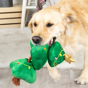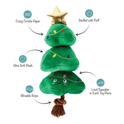Don't forget the tree topper! Our “Light Me Up” plush toy is perfect for playtime, anytime. This toy was designed with interactive play in mind with a loud squeaker and crazy crinkle paper in each tree section, plus a tuggable rope with sliding toy function. Whether you squeak, crinkle, tug, or toss it, you'll brighten up your pup's playtime.
