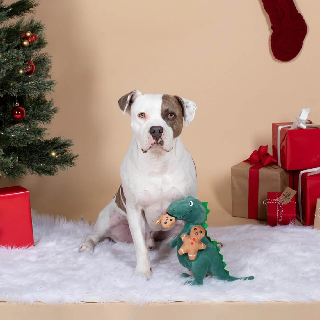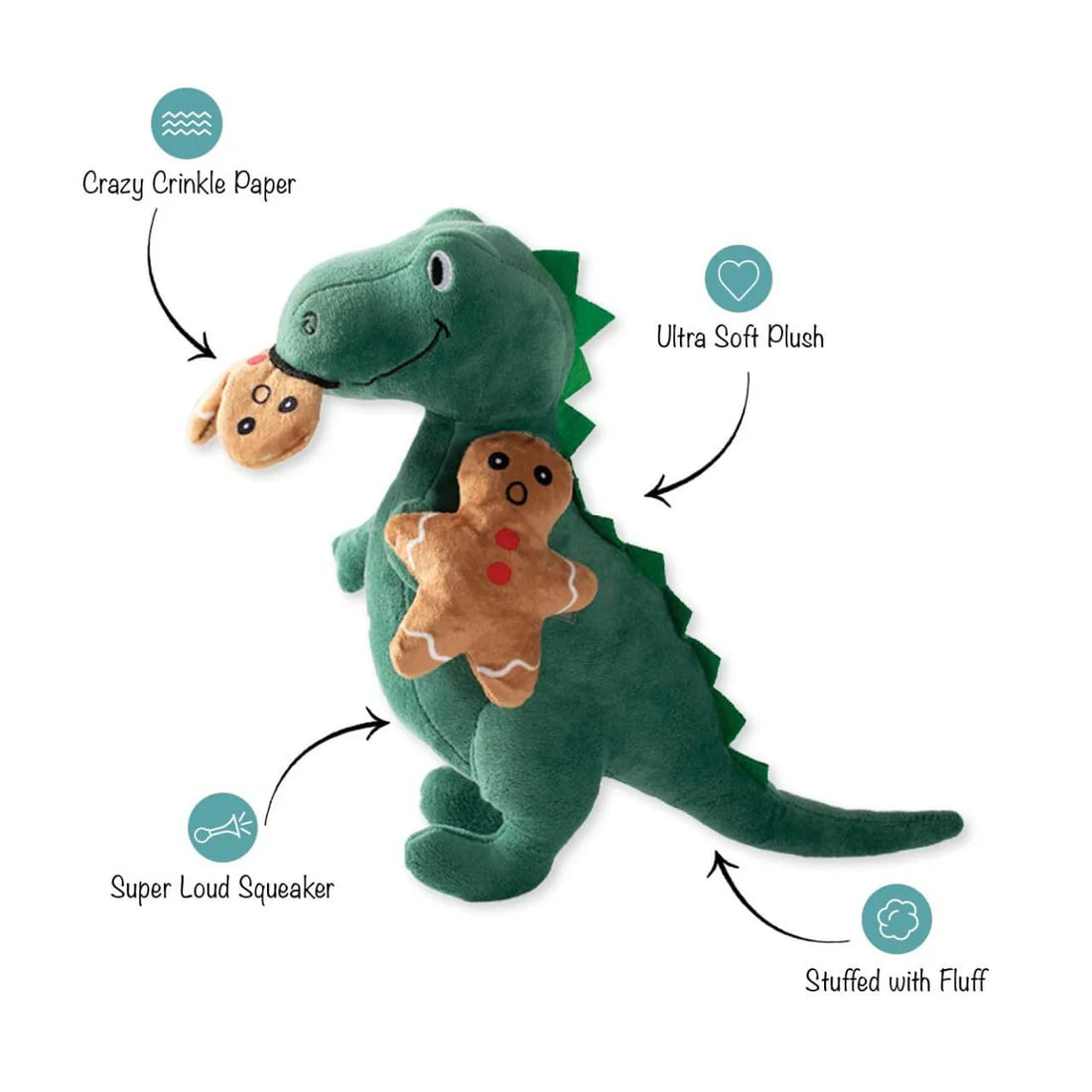 Make your dog’s paw-lidays extra special and fun with the Fringe Studio Christmas Oh Snap! T-Rex and Cookies Squeaky Plush Toy! The “Holiday Munchies” Oh, Snap! T-Rex Plush Dog Toy brings a whirlwind of festive fun to your dog’s playtime! This jolly T-Rex dinosaur loves to snack on gingerbread cookies and features an extra loud squeaker hidden inside, ensuring endless playtime excitement. Even the gingerbread men join in the fun with crinkle paper inside to make gentle chewing more satisfying and entertaining for your pet. Celebrate the holidays with a toy that's sure to bring joy and laughter to your furry friend!