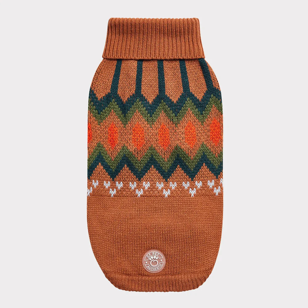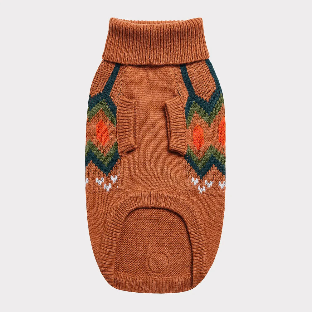 The GF Pet® turtleneck Heritage Dog Sweater is fun and unique, with its' native inspired vintage design and warm color combos. Comfortable, sculpted unisex fit. A must for all generations of dogs and owners!