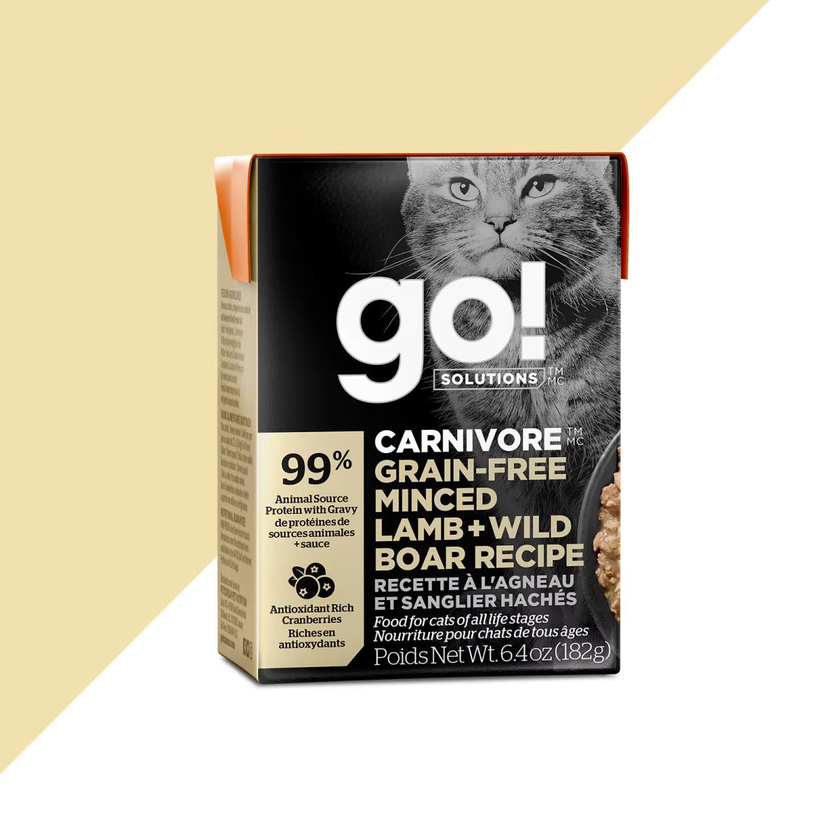 GO! SOLUTIONS CARNIVORE Grain-Free Minced Lamb + Wild Boar Recipe is formulated to meet the nutritional levels established by the AAFCO Cat Food Nutrient Profiles for All Life Stages.