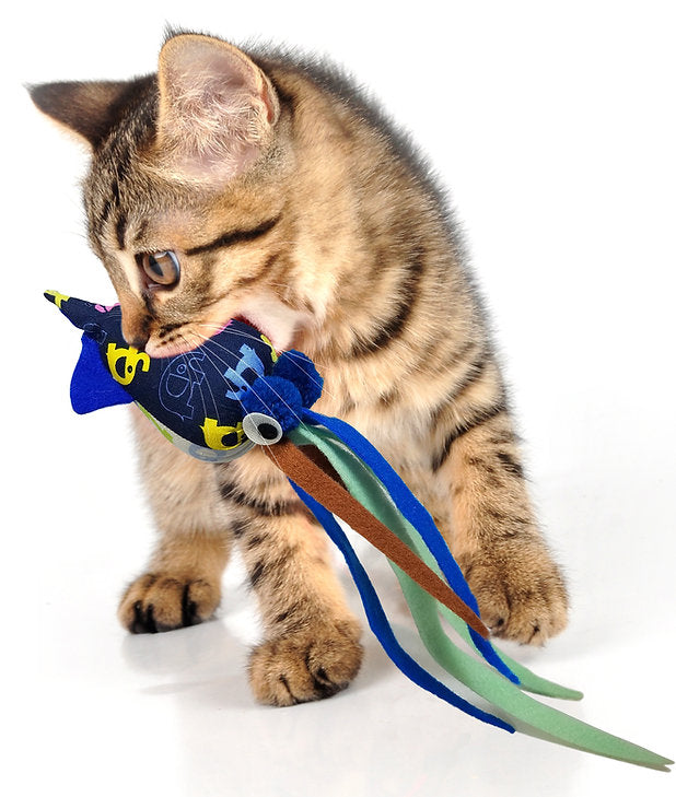 Drawing a lot of meowing interests, the Tenggo Squid is made with colorful, cotton mixed fabric. It is infused with catnip oil, derived from Naturally grown USA catnip. Is also contains bells that make a rattling sound with fleece tentacles for that extra fun. Tenggo squid measures 12" in length and 2" in height, also come in assortment of colors.