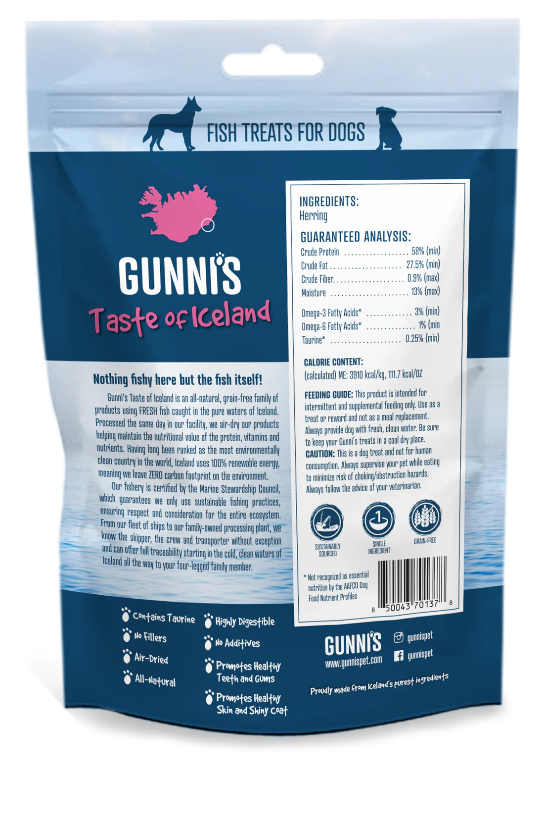 Our Whole Herring are super tasty, single ingredient dog treats. These treats are full of flavor and are an excellent source of omega 3 essential fatty acids. The herring is air dried using 100% renewable energy in our family-owned facility in Iceland. That's something to bark about!