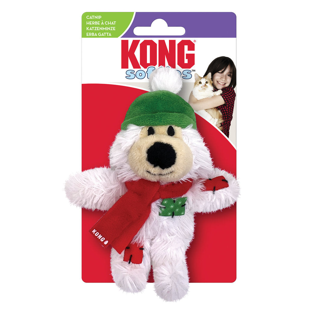 KONG Holiday Cat Softies Bear’s soft plush fabric and snuggly body invites comforting cuddles to keep kitties warm with a pal decked in a holiday hat and scarf. KONG Premium Catnip prolongs play while crackle satisfies natural instincts for a festive friend ideal for holiday fun.