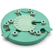 How to play: Place treats in circular blocks and compartments in the base. Swivel flippers to cover tracks and lock spinning top. Let the games begin! Place game on floor and encourage your pet to seek treats. Dogs are smarter than you think. Sometimes we just need to teach them! Swivel flippers off the tracks to make this game easier and show your dog how the blocks slide.