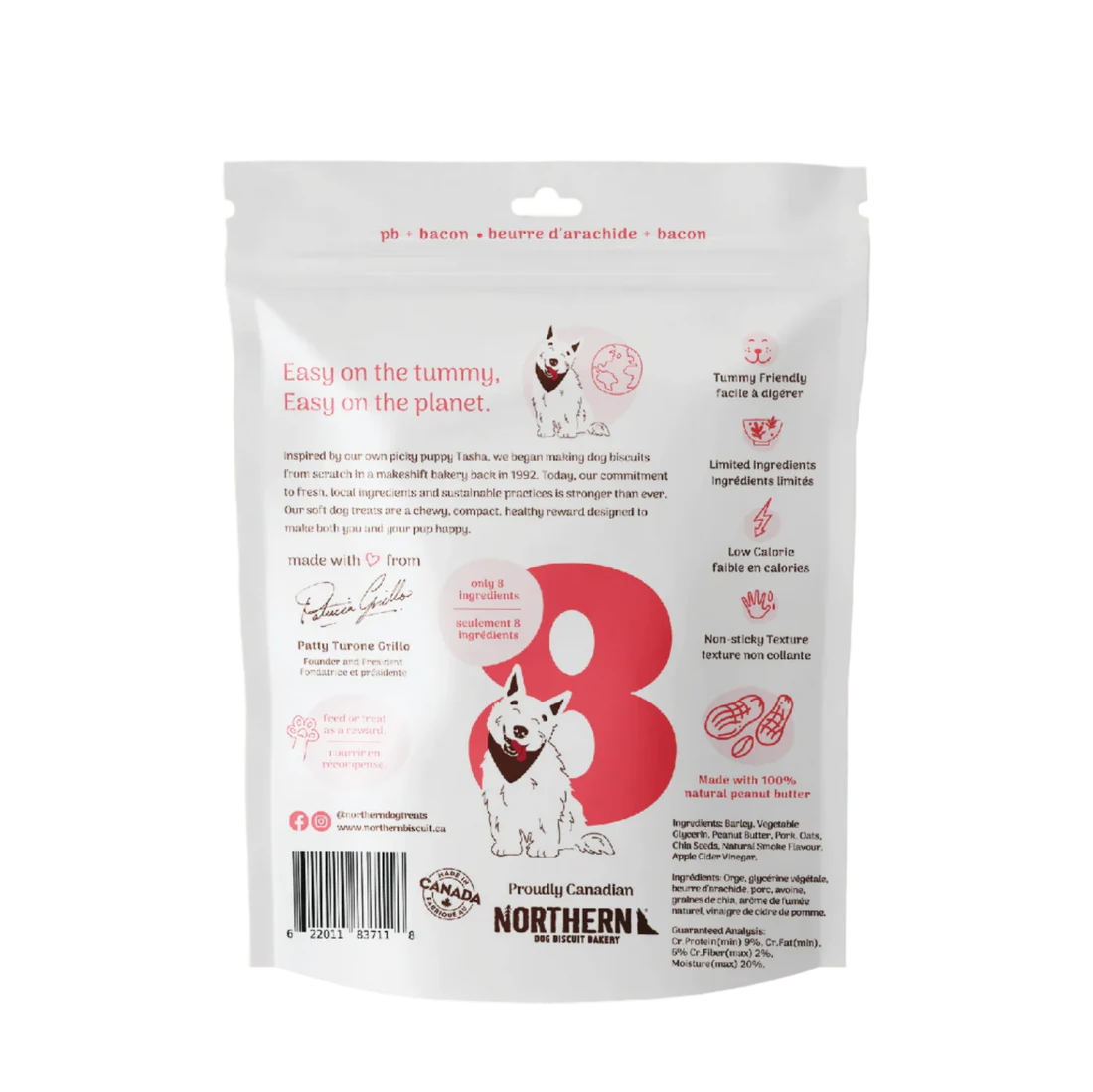 Northern Softies PB & Bacon Treats are soft & chewy and sure to be your pup’s new favourite high-value treat. These wheat-free dog treats are made with only 8 natural and locally sourced ingredients and have a non-sticky texture that makes them the perfect on-the-go reward for dogs of all ages. Packed with flavour and only 3 calories per treat, Northern Softies are ideal for frequent treating or training.