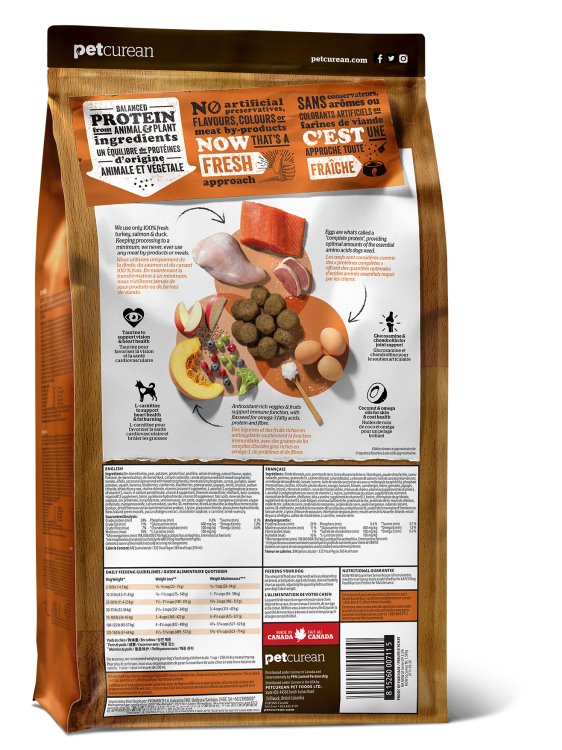 De-boned turkey, potato flour, apples, pea fibre, peas, potatoes, tomato, alfalfa, canola oil (preserved with mixed tocopherols), natural flavour, salmon, de-boned duck, coconut oil (preserved with mixed tocopherols), whole dried egg, flaxseed, carrots, pumpkin, sweet potatoes, squash, bananas, blueberries, cranberries, blackberries, pomegranate, papayas, lentils, broccoli, calcium carbonate, dicalcium phosphate, sodium chloride, potassium chloride, vitamins (vitamin E supplement, L-ascorbyl-2-polyphosphate (a source of vitamin C), niacin, vitamin A supplement, thiamine mononitrate, d-calcium pantothenate, pyridoxine hydrochloride, riboflavin, beta-carotene, vitamin D3 supplement, folic acid, biotin, vitamin B12 supplement), minerals (zinc proteinate, ferrous sulphate, zinc oxide, iron proteinate, copper sulphate, copper proteinate, manganese proteinate, manganous oxide, calcium iodate, selenium yeast), taurine, DL-methionine, L-lysine, glucosamine hydrochloride, dried chicory root, dried Lactobacillus acidophilus fermentation product, dried Enterococcus faecium fermentation product, yucca schidigera extract, chondroitin sulphate, L-carnitine, dried rosemary.