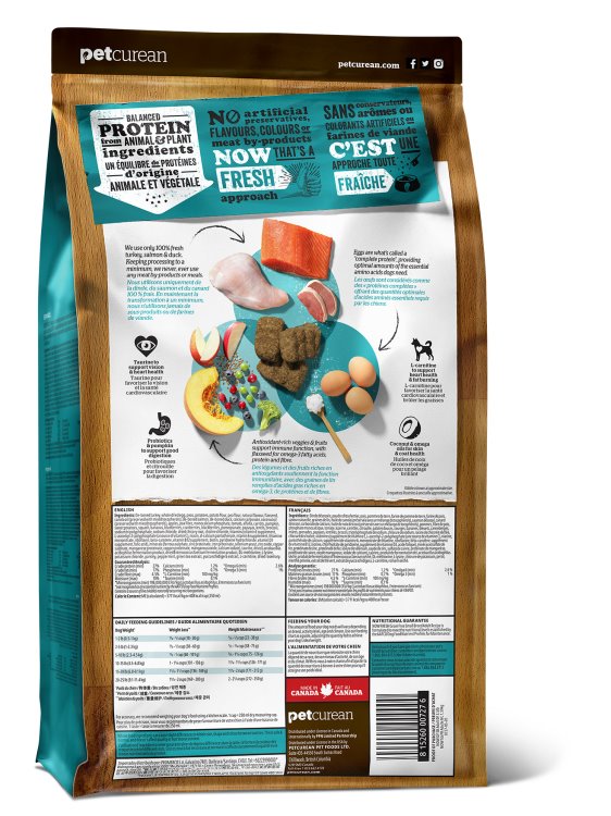 De-boned turkey, potatoes, peas, whole dried egg, tapioca, potato flour, natural flavour, pea fibre, flaxseed, apples, de-boned salmon, de-boned duck, sweet potatoes, calcium phosphate, canola oil (preserved with mixed tocopherols), coconut oil (preserved with mixed tocopherols), alfalfa, carrots, pumpkin, bananas, blueberries, cranberries, blackberries, papayas, lentil beans, broccoli, spinach, squash, pomegranate, dried chicory root, dried kelp, calcium carbonate, sodium chloride, potassium chloride, vitamins (vitamin A supplement, vitamin D3 supplement, vitamin E supplement, niacin, L-ascorbyl-2-polyphosphate (a source of vitamin C), d-calcium pantothenate, thiamine mononitrate, beta-carotene, riboflavin, pyridoxine hydrochloride, folic acid, biotin, vitamin B12 supplement), minerals (zinc methionine complex, zinc proteinate, iron proteinate, copper proteinate, zinc oxide, manganese proteinate, copper sulphate, ferrous sulphate, calcium iodate, manganous oxide, selenium yeast), taurine, DL-methionine, L-lysine, glucosamine hydrochloride, dried Lactobacillus acidophilus fermentation product, dried Enterococcus faecium fermentation product, dried Aspergillus niger fermentation product, dried Aspergillus oryzae fermentation product, yeast extract, New Zealand green mussels, yucca schidigera extract, chondroitin sulphate, marigold, L-carnitine, dried rosemary, green tea extract, peppermint, parsley, rosehips, zedoary, dandelion, chamomile, ginger, turmeric, fennel, juniper berries, licorice, cardamom, cloves.