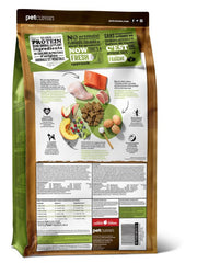 De-boned turkey, whole dried egg, potatoes, potato flour, peas, pea flour, apples, natural flavour, flaxseed, de-boned salmon, de-boned duck, canola oil (preserved with mixed tocopherols), tomato, calcium carbonate, dicalcium phosphate, coconut oil (preserved with mixed tocopherols), alfalfa, carrots, pumpkin, sweet potatoes, squash, bananas, blueberries, cranberries, blackberries, pomegranate, papayas, lentils, broccoli, dried chicory root, sodium tripolyphosphate, sodium chloride, choline chloride, vitamins (vitamin A supplement, vitamin D3 supplement, vitamin E supplement, niacin, L-ascorbyl-2-polyphosphate (a source of vitamin C), d-calcium pantothenate, thiamine mononitrate, beta-carotene, riboflavin, pyridoxine hydrochloride, folic acid, biotin, vitamin B12 supplement), minerals (zinc proteinate, iron proteinate, copper proteinate, zinc oxide, manganese proteinate, copper sulphate, ferrous sulphate, calcium iodate, manganous oxide, selenium yeast), taurine, DL-methionine, L-lysine, glucosamine hydrochloride, dried Lactobacillus acidophilus fermentation product, dried Enterococcus faecium fermentation product, New Zealand green mussels, chondroitin sulphate, parsley, peppermint, green tea extract, L-carnitine, dried rosemary.