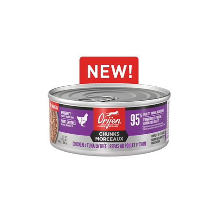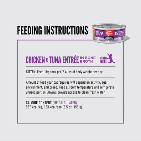 ORIJEN Chunks Chicken & Tuna Entrée in Bone Broth Complete Kitten Food is formulated to meet the nutritional levels established by the AAFCO Cat Food Nutrient Profiles for Growth.