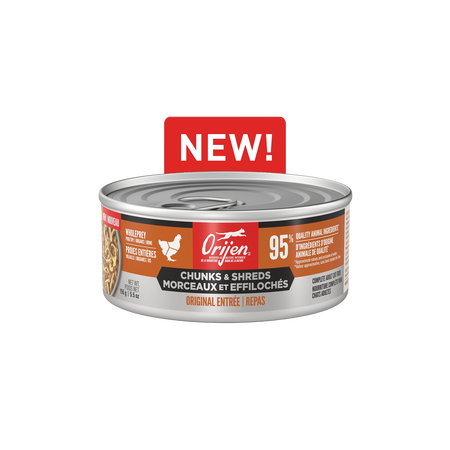 Nourish your cat completely with hearty WholePrey animal ingredients and real shreds of meat, poultry or fish in ORIJEN™ Chunks & Shreds Wet Cat Food! Cats are obligate carnivores, so they thrive off a diet packed with animal ingredients. That’s why our Original Entrée recipe includes a whopping 95% animal ingredients1, including chicken and salmon, to provide your cat with the Biologically Appropriate nourishment they were born to eat. This diet also includes succulent WholePrey ingredients like chicken liver to provide your cat with rich and varied nutrients. Bone broth helps support your cat’s hydration, while also adding tempting flavour. Nourish your cat with the texture and variety of raw animal ingredients packed into every can of ORIJEN™ Chunks & Shreds.