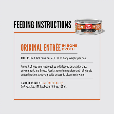 ORIJEN Chunks & Shreds Original Entrée in Bone Broth Complete Adult Cat Food is formulated to meet the nutritional levels established by the AAFCO Cat Food Nutrient Profiles for maintenance.
