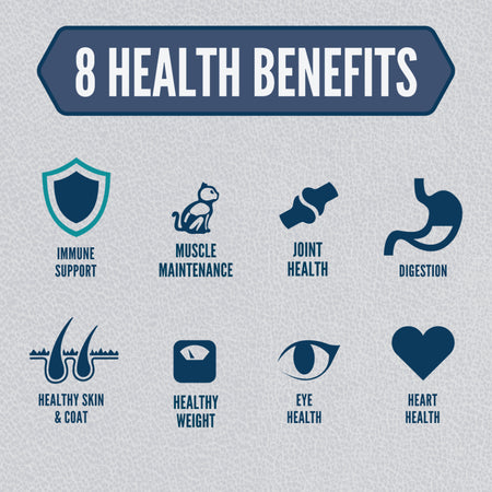 - Helps support 8 key health benefits including Immune Support, Digestion, Healthy Skin & Coat, Heart Health, Lean Muscle Maintenance, Healthy Joints & Bones, Healthy Weight, and Eye Health.