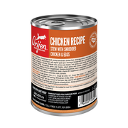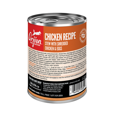 ORIJEN® Chicken Recipe Stew is a nourishing wet food with rich inclusions of savory chicken shreds that will help your dog thrive. Packed with 95%* premium animal ingredients, ORIJEN Chicken Recipe Stew includes fresh or raw chicken ingredients. This includes succulent WholePrey ingredients like organs and bone to add a source of essential vitamins, minerals and amino acids. Feed your dog ORIJEN Premium Wet Dog Food alone to add moisture and nourishment to their diet, or add it on top of their favorite ORIJEN kibble for a nutritious addition at mealtime.
