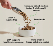 RawMix features our protein-packed kibble covered in a nutritious bone broth and freeze dried raw coating, with added chunks of freeze dried raw. Crafted with a blend of 100% animal welfare certified chicken, turkey, and wild-caught salmon, this irresistible recipe includes nutrient-dense meat, organ, and bone. This recipe is packed with natural nutrition tailored for kittens including natural DHA to support health brain and eye development.